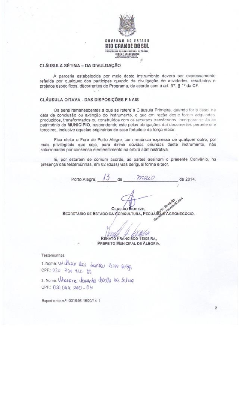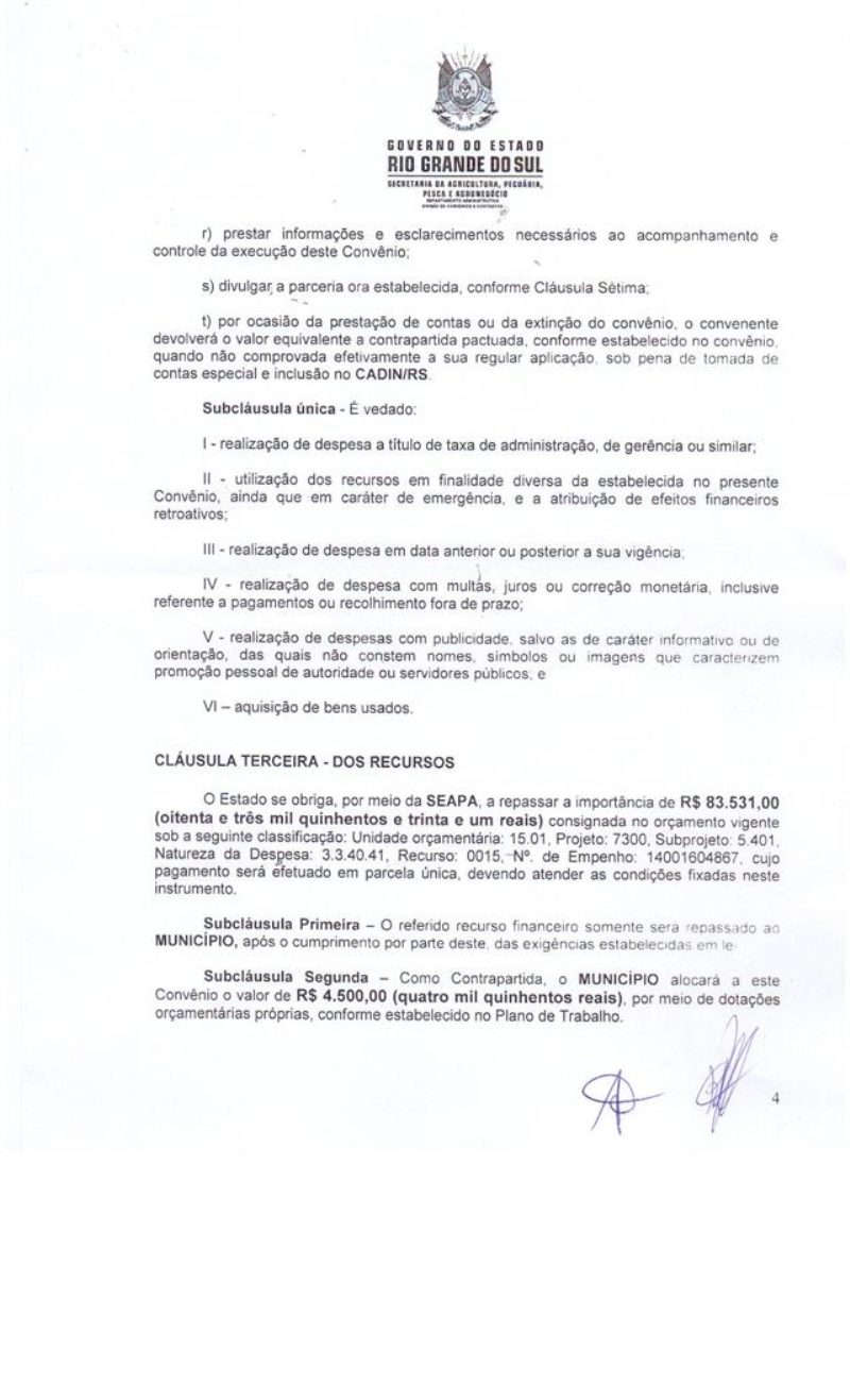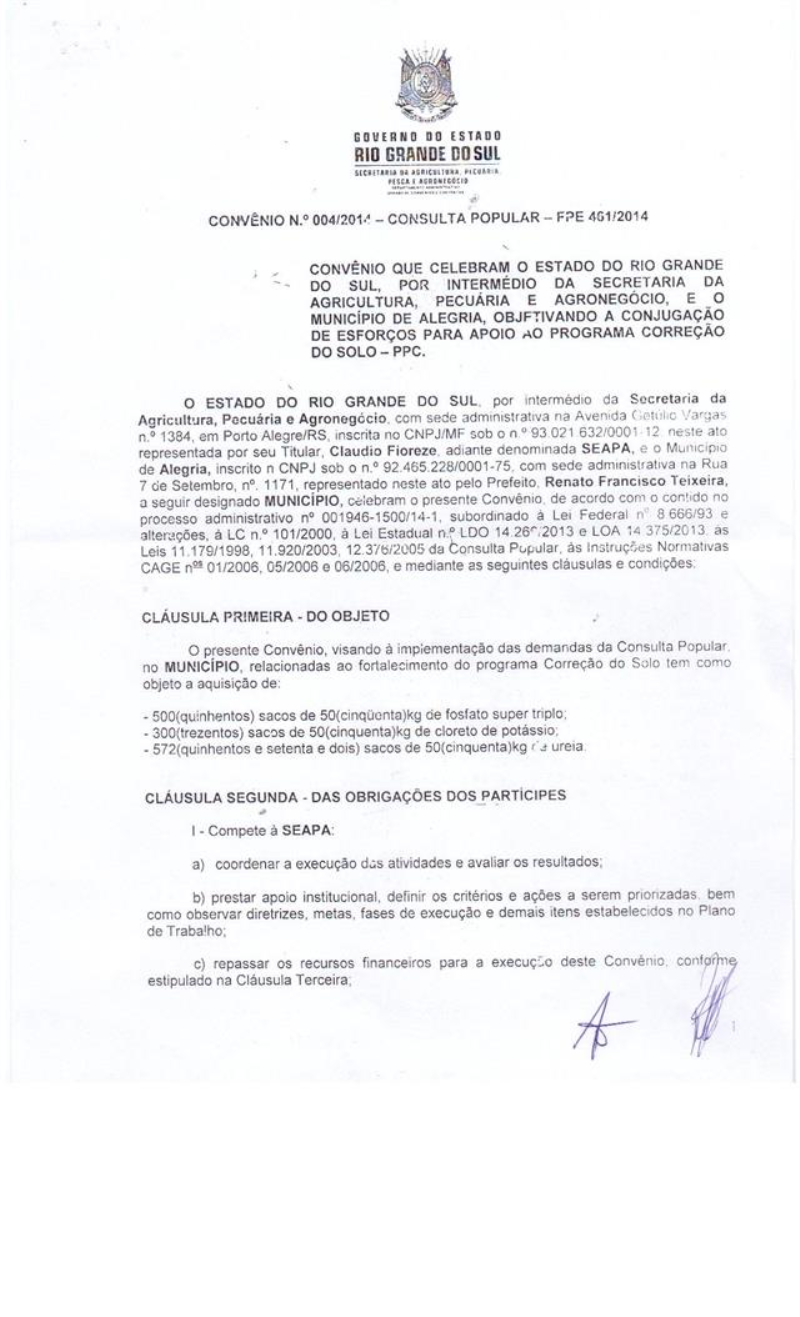 O Municipio foi contemplado com a liberação de recursos da Consulta Popular, através do Convênio 004/2014, no valor de R$ 83.531,00 (oitenta e três mil quinhentos e trinta e um reais) e contrapartida de R$ 4.500,00 (quatro mil e quinhentos reais), para serem investidos na Correção do Solo, o convênio na Integra encontra-se em anexo.