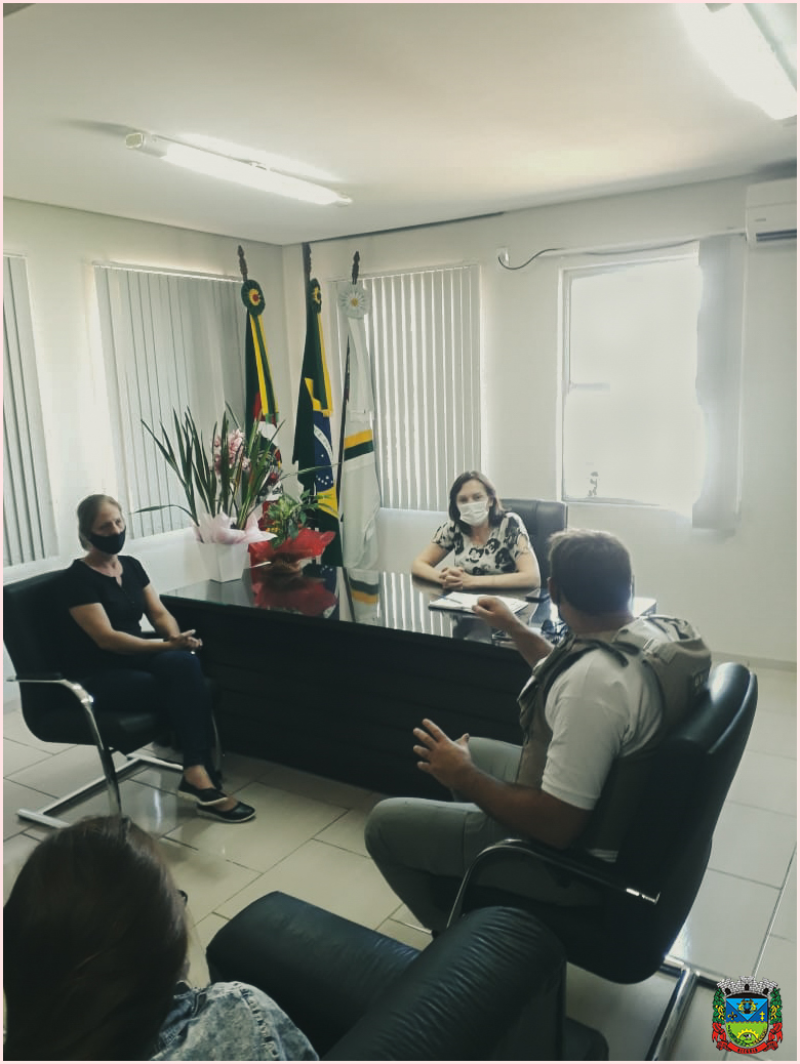 Na manhã de hoje (11), a Prefeita Municipal, Teresinha Marczewski Zavaski, a Secretária Municipal de Administração, Kássia Regina de Oliveira, Secretária Municipal de Coordenação e Planejamento, Pâmella Ruama Ianke Preissler e as Fiscais Municipais Sheila Christiane Muller e Vani Nehring Mella estiveram reunidas com o Comandante da Brigada Militar de Alegria Sd. Filipin para debater assuntos referentes ao COVID-19.